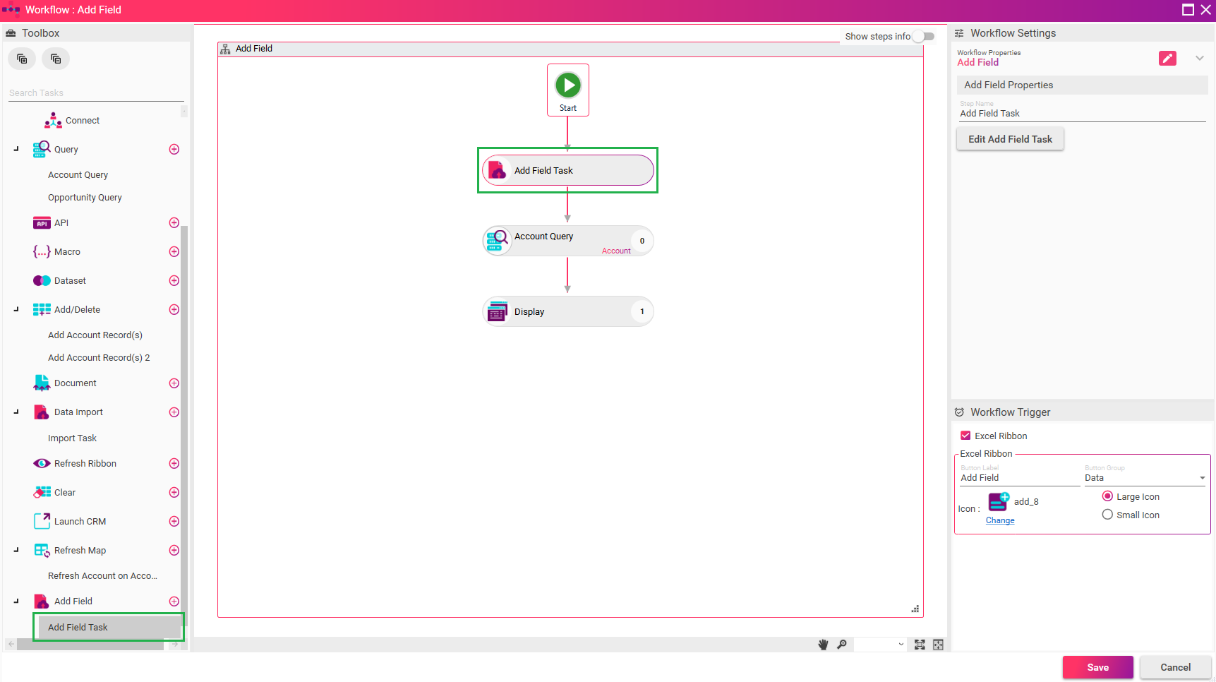 Drag and drop the Add Field task properties in the workflow which will be shown under Add Field.