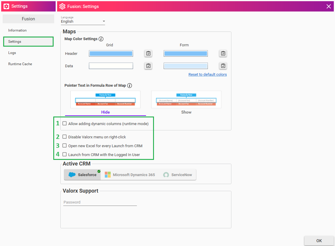 Fusion settings are those which will allow the user to make any settings to the Maps, providing an option to select the CRM platforms and Valorx Support.