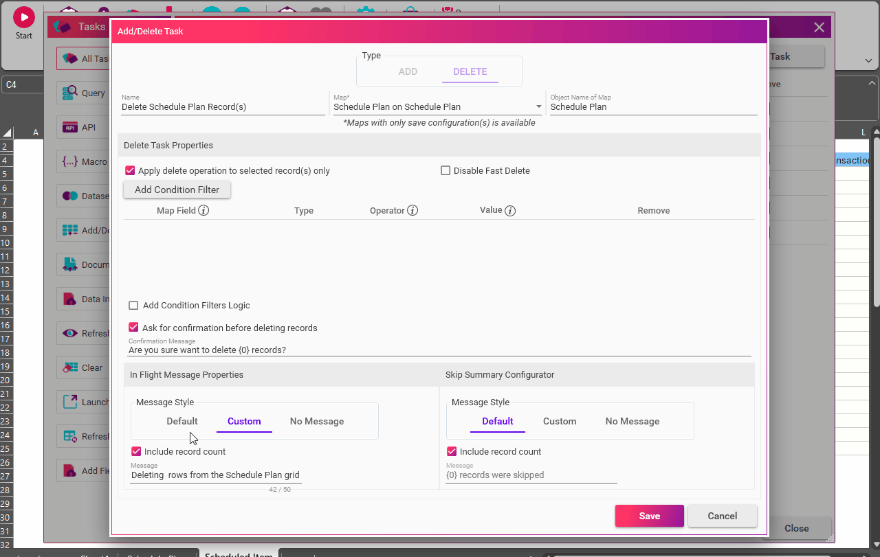 Designers now have more control over skip messages during Delete Tasks. A new **‘No Message’** option in the **Skip Summary Configurator** allows you to completely suppress runtime messages for skipped records.
